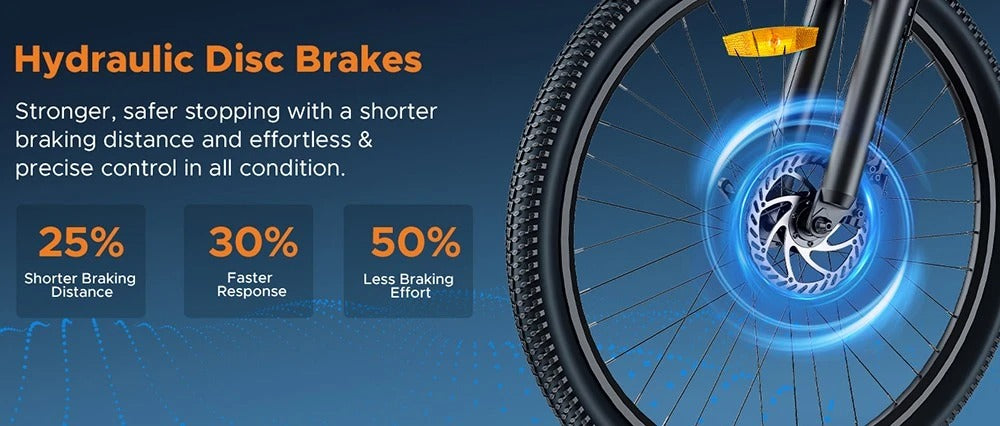 • The hydraulic disc brakes provide a more safe and efficient braking for every riding.
